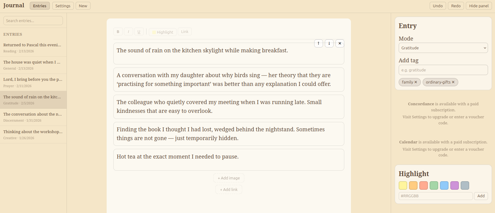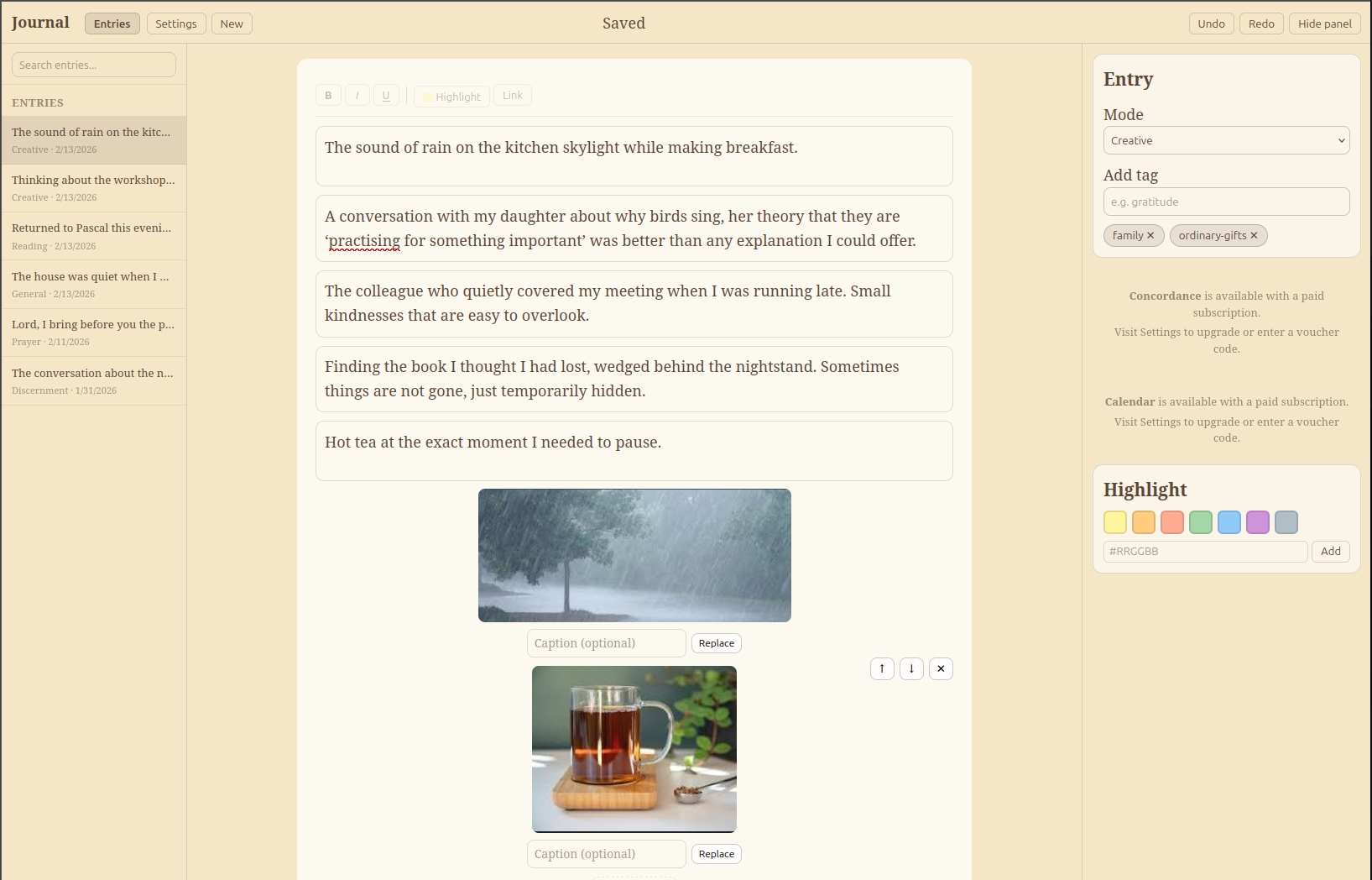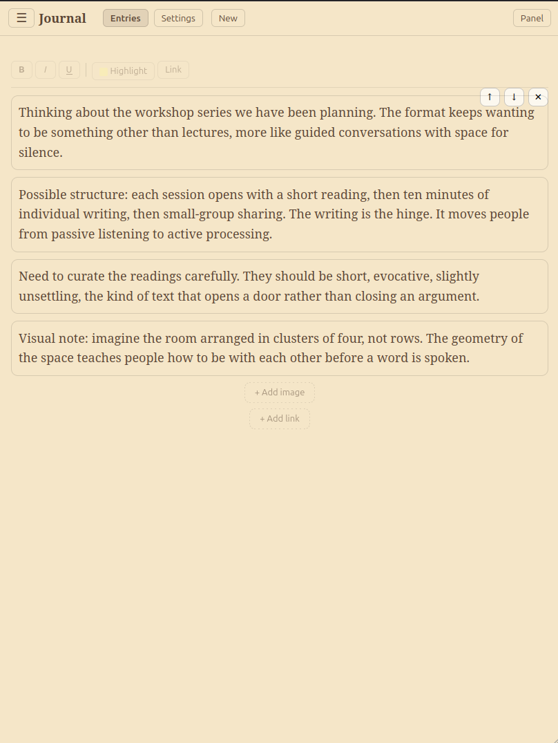 A block-based journaling platform with rich text, images, links, and context-aware writing modes. Encrypted storage with client-derived keys, deterministic entitlements, and no hidden data processing.